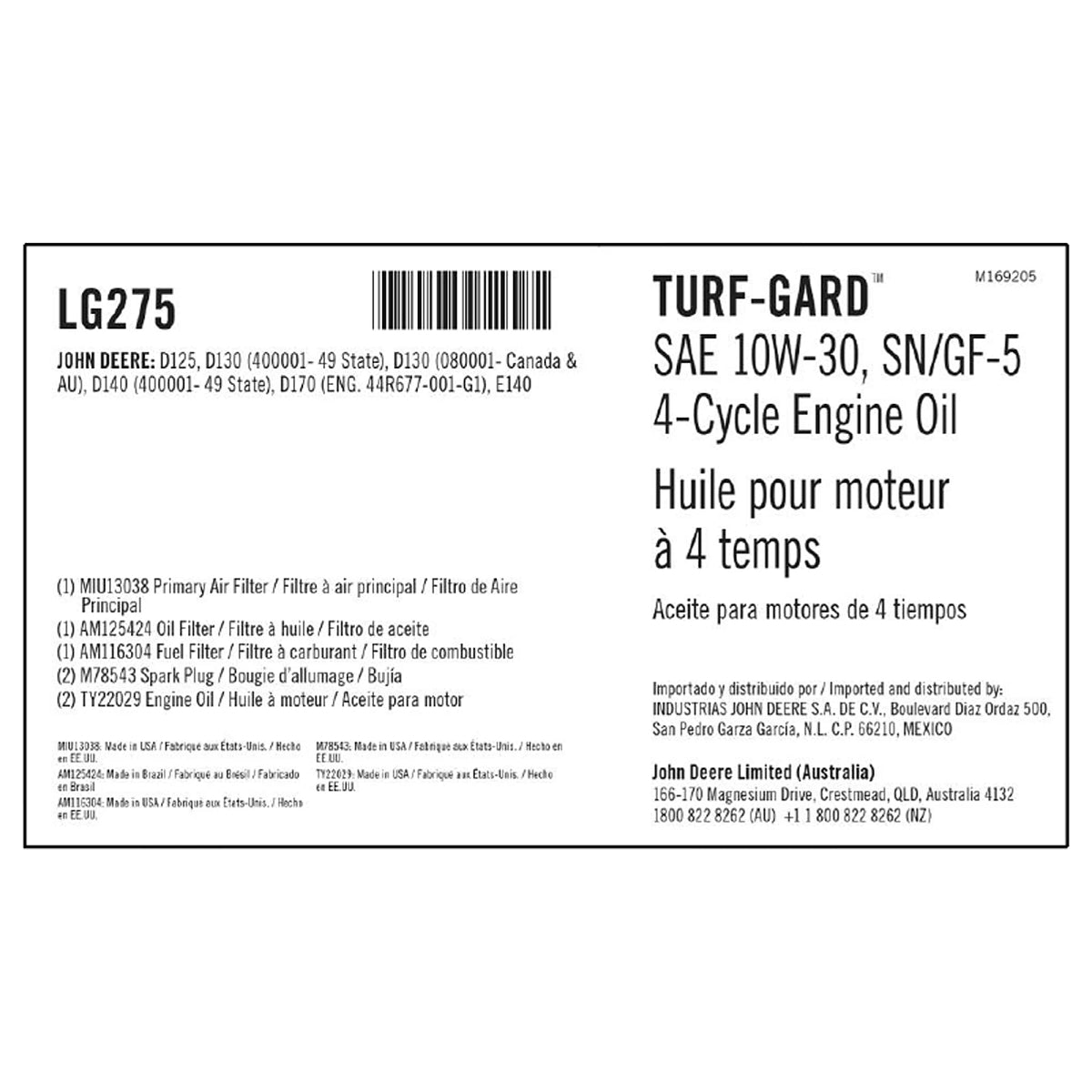 Kit Includes: AM116304 - Inline Fuel Filter, AM125424 - Engine Oil Filter, DKE984696 - Oil Change Label, 2 X M78543 - Spark Plug, MIU13038 - Engine Air Cleaner, 2 X TY22029 - 4-Cycle Engine Oil, TURF-GARD, 10W-30, API SN/GF6, 946 ml (32 Fluid Oz)
