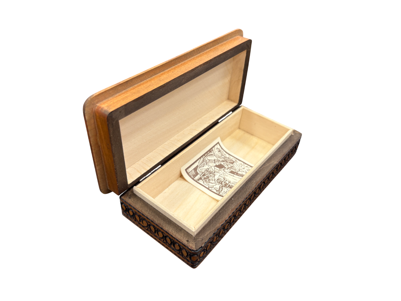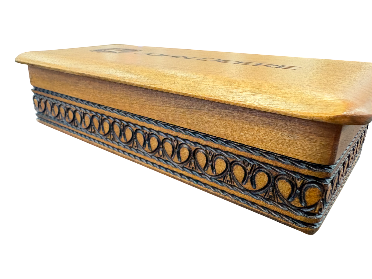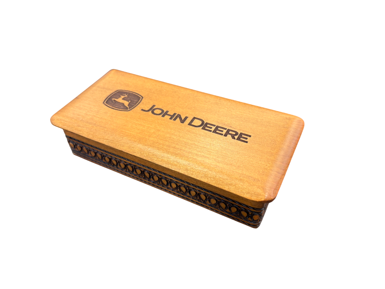 This wooden box is hand crafted in Poland from Linden wood. The lid has a gentle curve and is connected to the base with hinges. The John Deere logo and name are engraved on the top of the box.