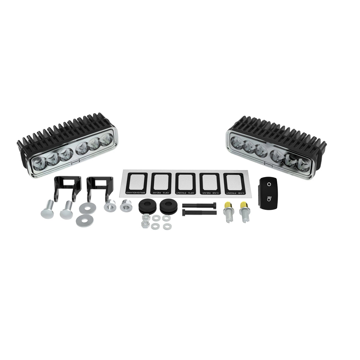 The LED work lights can be mounted on the front occupant protective structure (OPS), front cab, rear OPS, rear cab, or brush guard